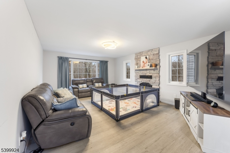 Beautifully updated Colonial nestled on 4 private acres in peaceful Knowlton, NJ. Enjoy a charming covered front porch, landscaped grounds, and serene natural surroundings. This home offers 4 bedrooms, 2.5 baths, a large 2-car garage, and spacious indoor/outdoor living areas. The open kitchen features granite countertops, stainless steel appliances, and a generous dining area. The inviting family room highlights a stone fireplace and oversized picture window with gorgeous views. A first-floor office with French doors is perfect for working from home. Formal dining/living rooms open to an expansive rear patio ideal for entertaining. New LVP flooring throughout the first level. Upstairs, the primary suite includes two cedar walk-in closets, a skylight ceiling, and a private bath. Three additional bedrooms and a full bath complete the second floor. The basement provides excellent storage, flexible space, and a small wine cellar/craft room. Recent updates include a **brand-new stove, microwave, and garage door openers. A rare combination of beauty, privacy, and comfort move-in ready and truly special.