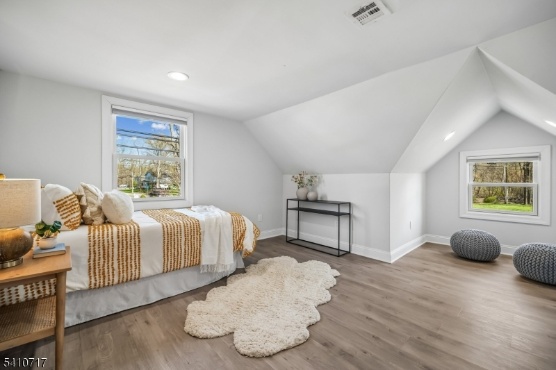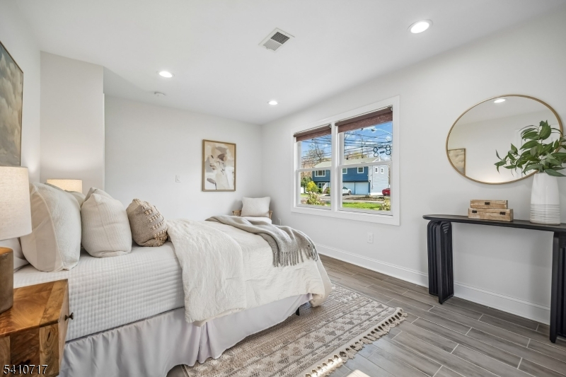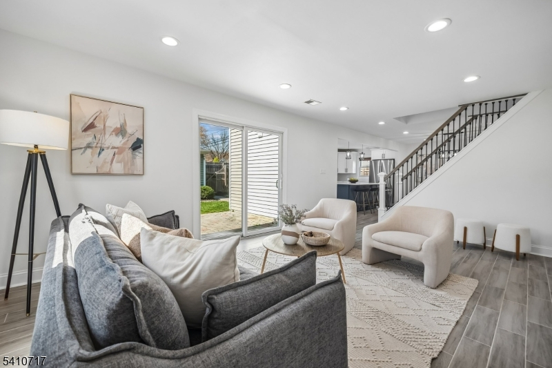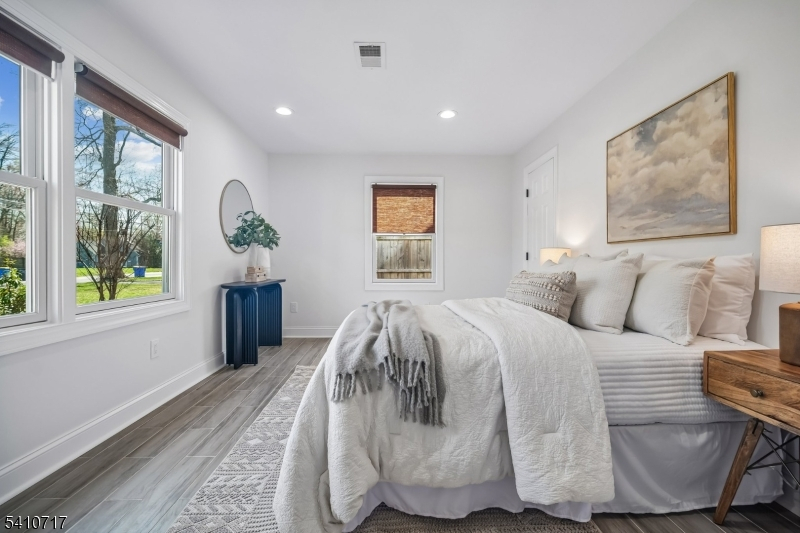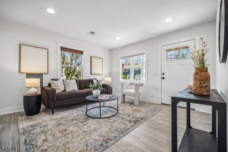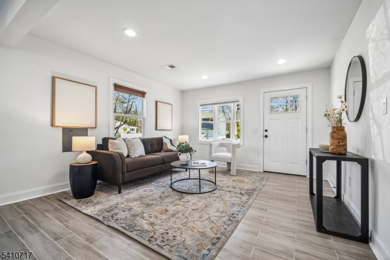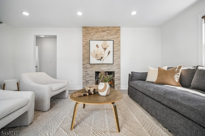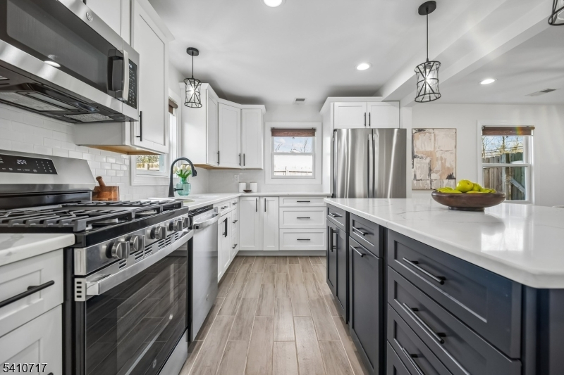 Fabulously renovated, this four-bedroom, three-full-bath Cape Cod offers an appealing blend of style, comfort, and flexibility, complete with an oversized detached garage and storage loft. A paver walkway, covered front entrance, and stone-accented facade create inviting curb appeal. Inside, the open floor plan offers versatile living and entertaining spaces. The sun-filled living room with bay window flows seamlessly into the dining area with chandelier. The modern kitchen features white cabinetry, calacatta quartz countertops, stainless steel appliances, and a deep blue center island with seating and pendant lighting, while open sightlines to the family room help keep daily living and entertaining connected. The family room offers a comfortable gathering space with a stone fireplace and sliding doors to the paver patio. A spacious first-floor bedroom is well suited for guests, with a nearby full bath featuring a walk-in glass shower. Luxury vinyl flooring, recessed lighting, and a convenient laundry closet with pantry storage complete the first level. Upstairs, the bright primary suite includes a walk-in closet and full bath with custom tiled shower and vanity, both enhanced by barn-style doors. Two additional bedrooms share a hall bath. Outside, recently updated landscaping in the front and back yards includes perennial plantings, while a wood-fenced private rear yard offers garden areas, a paver patio for outdoor dining, and open lawn space for recreation.