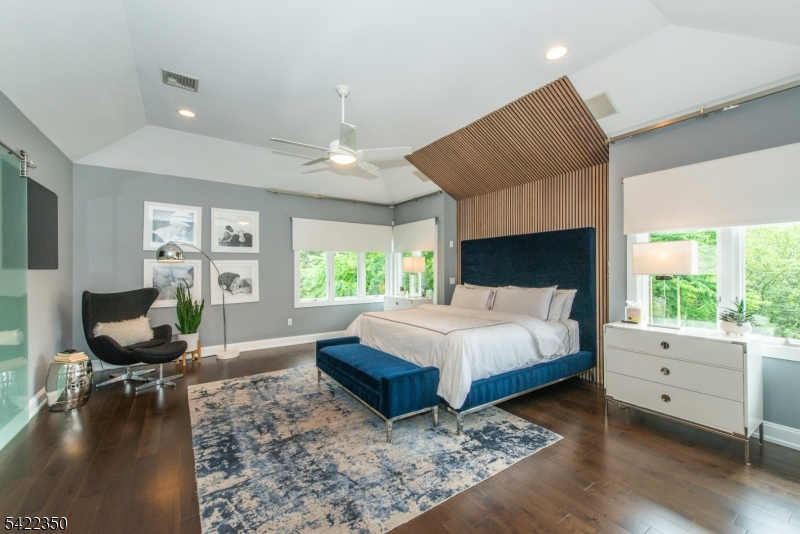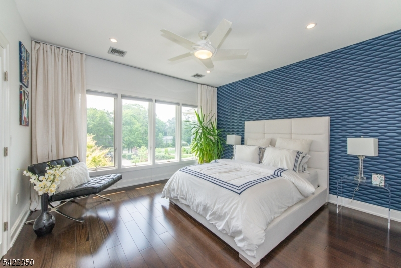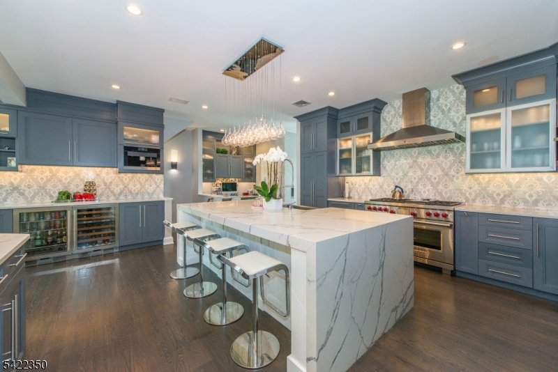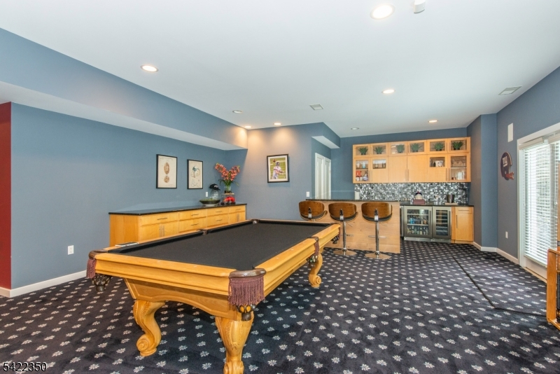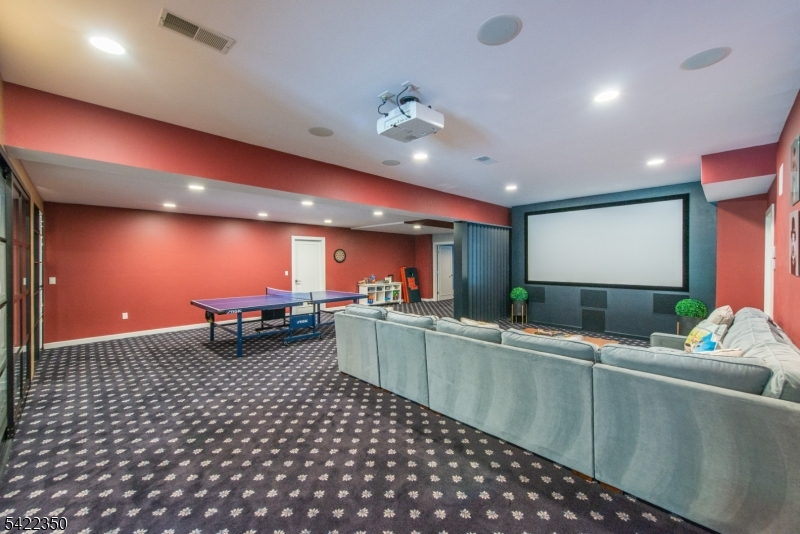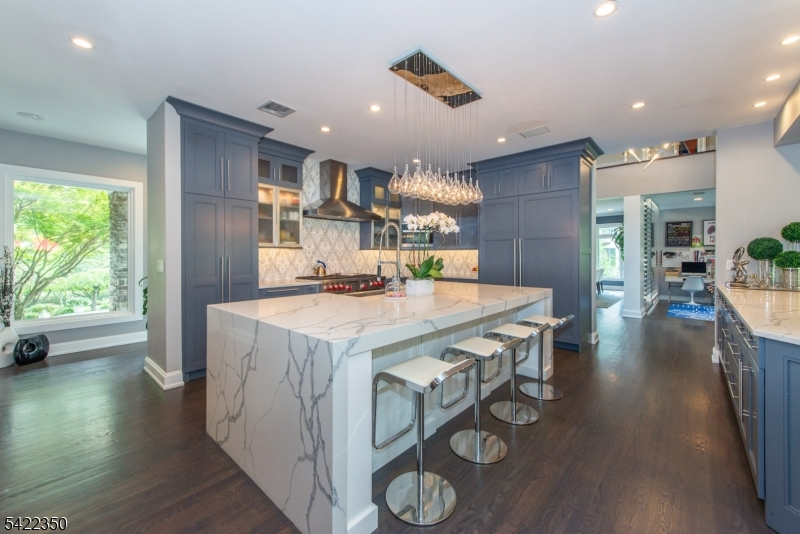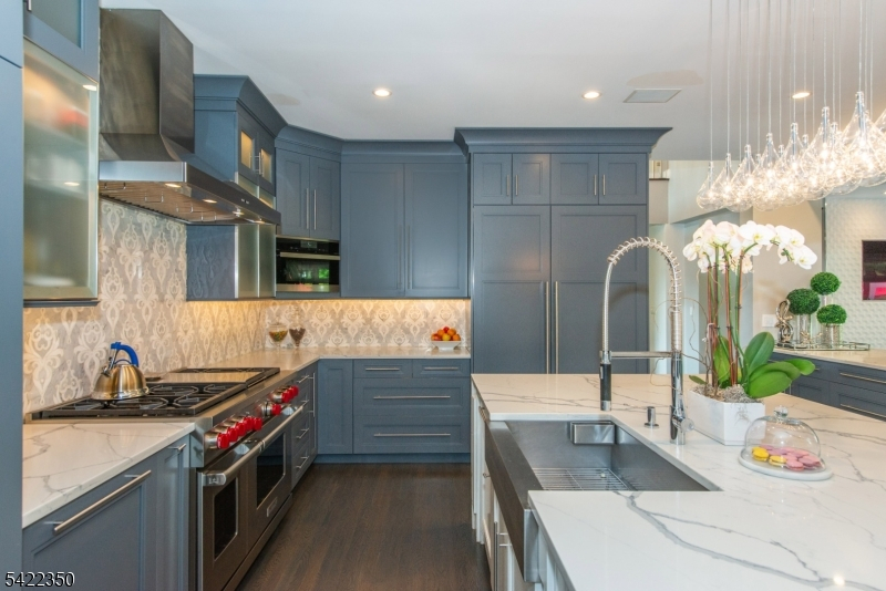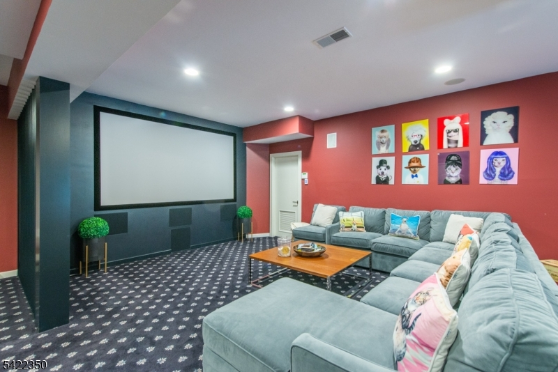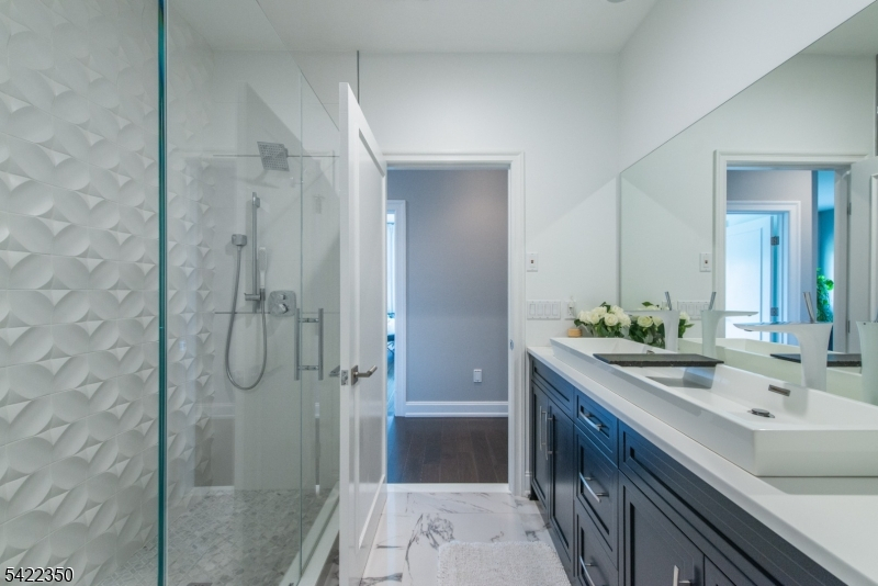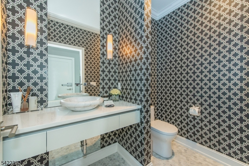 Experience sophisticated luxury in this stunning contemporary New York-style penthouse-inspired home, set in the serene suburbs of New Jersey. This exceptional residence showcases modern design, high-end finishes, and impeccable attention to detail throughout. Enter through a dramatic two-story foyer with striking lighting, glass panels, and sleek stainless steel railings. The elegant dining room features a custom wine wall, perfect for entertaining. The designer chef's kitchen offers quartz countertops, custom cabinetry, and premium finishes. The sunken family room is filled with natural light from walls of glass and features a built-in gas fireplace. Select rooms highlight accent walls with custom 3D detailing, adding a unique and modern touch. Step outside to a resort-style backyard with multiple seating areas, landscaped grounds, and space for play or relaxation. The finished lower level is an entertainer's dream with a private movie theater, cigar lounge, and home gym. A dedicated home office provides the perfect work-from-home setup. The luxurious primary suite features a custom dressing area with built-in closets and display storage. With 5 bedrooms and 5.5 baths, this home offers the perfect blend of comfort, style, and upscale living.